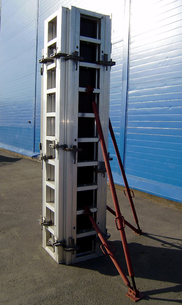 Алюминиевая опалубка колонн представляет собой щиты с каркасом из алюминиевого сплава и формообразующей поверхностью из ламинированной фанеры. Этот вид опалубки относится к первому классу по ГОСТу 52085-2003 и подходит для бетонирования колонн с прямоугольным и квадратным сечением.