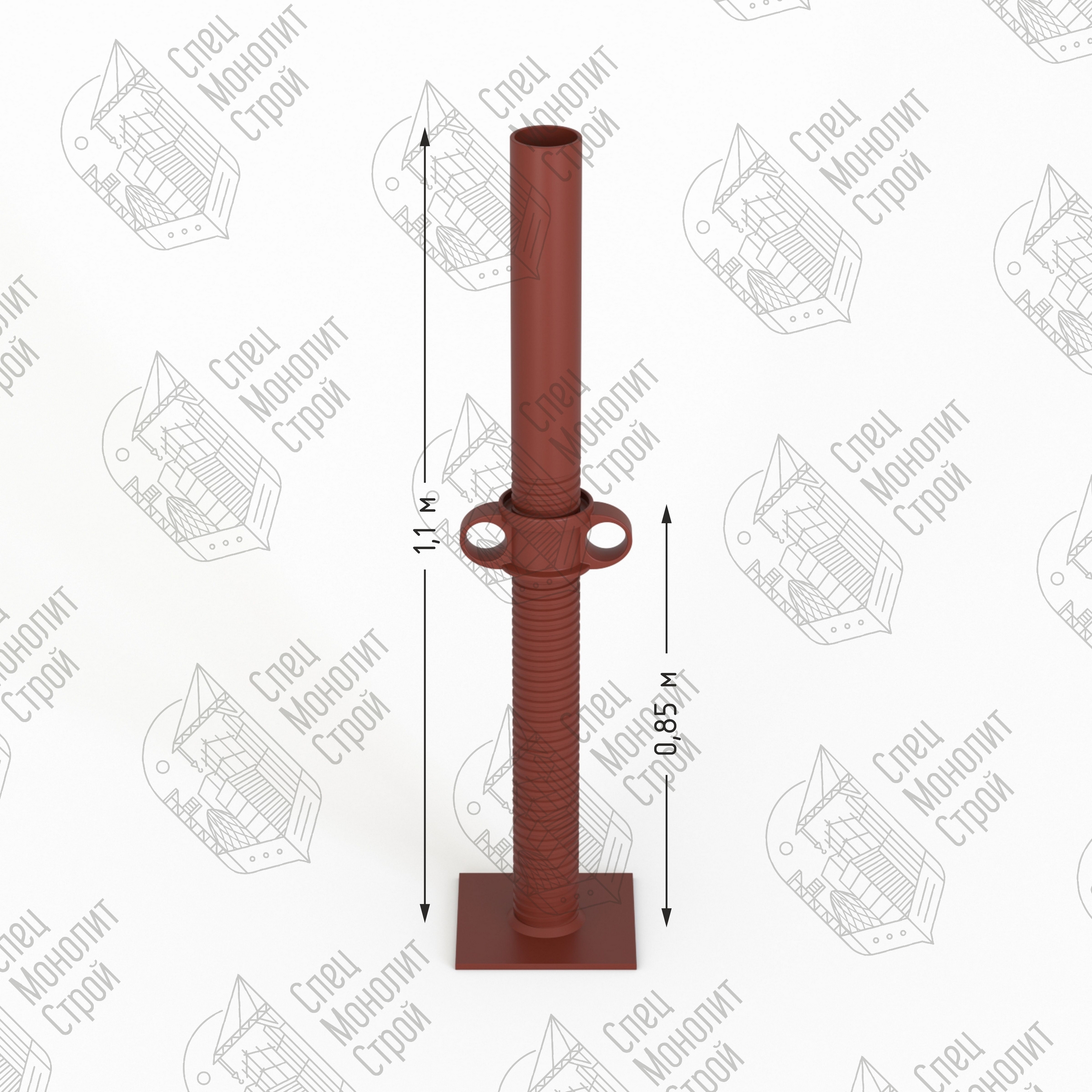 Домкрат ( опорный элемент) является опорой для стоек в случае перепадов высоты опорной поверхности на месте монтажа опалубки. Кроме того, домкраты устанавливаются на верхние стойки и обеспечивают юстировку опалубки по высоте. Представляет из себя опорную площадку("пятку") и приваренную к ней трубу с резьбой и гайкой. Как правило существует три стандартных размера домкратов: 600 мм. (рабочая длина 350 мм.), 850 мм. (рабочая длина 600 мм.) и 1100 мм.(рабочая длина 850 мм.).