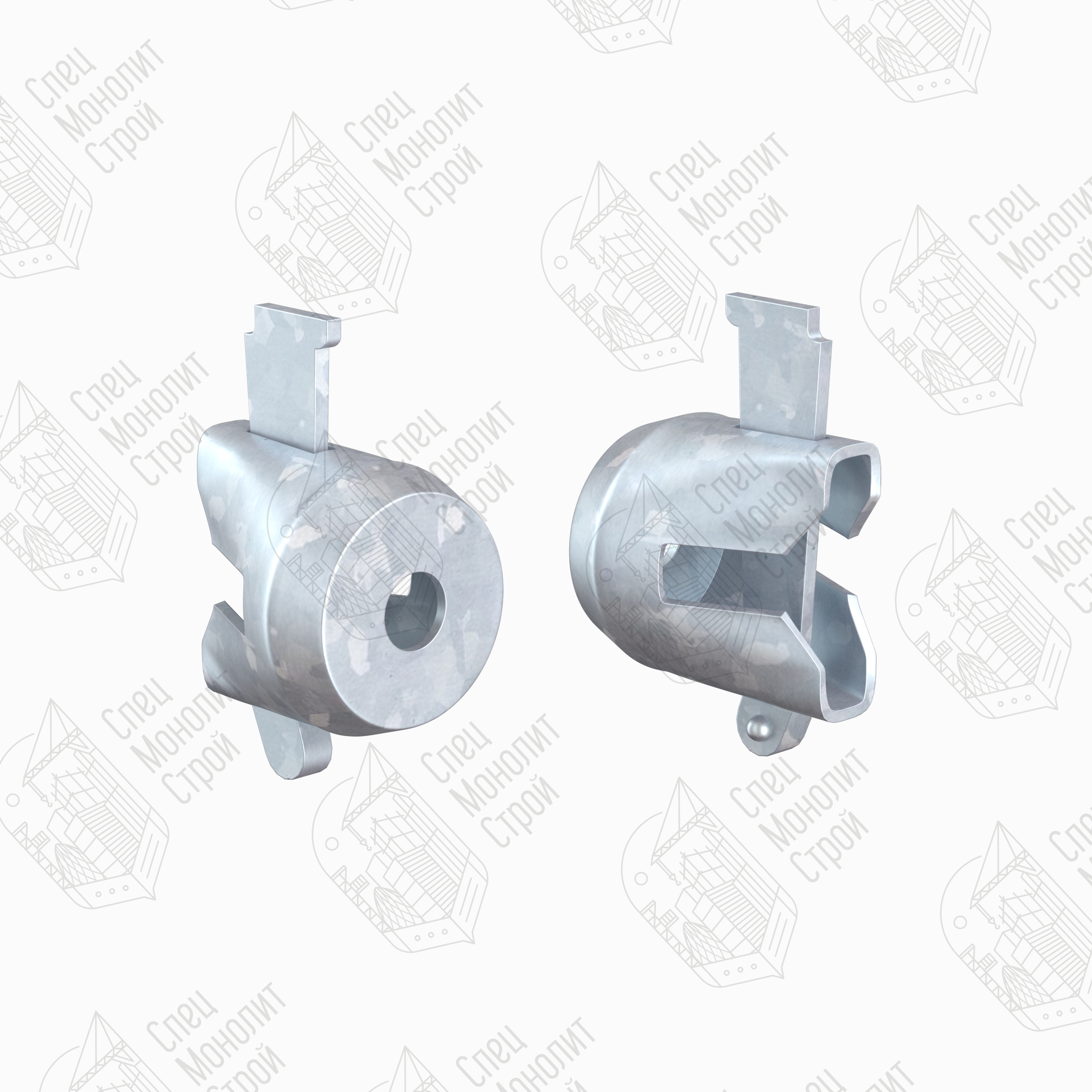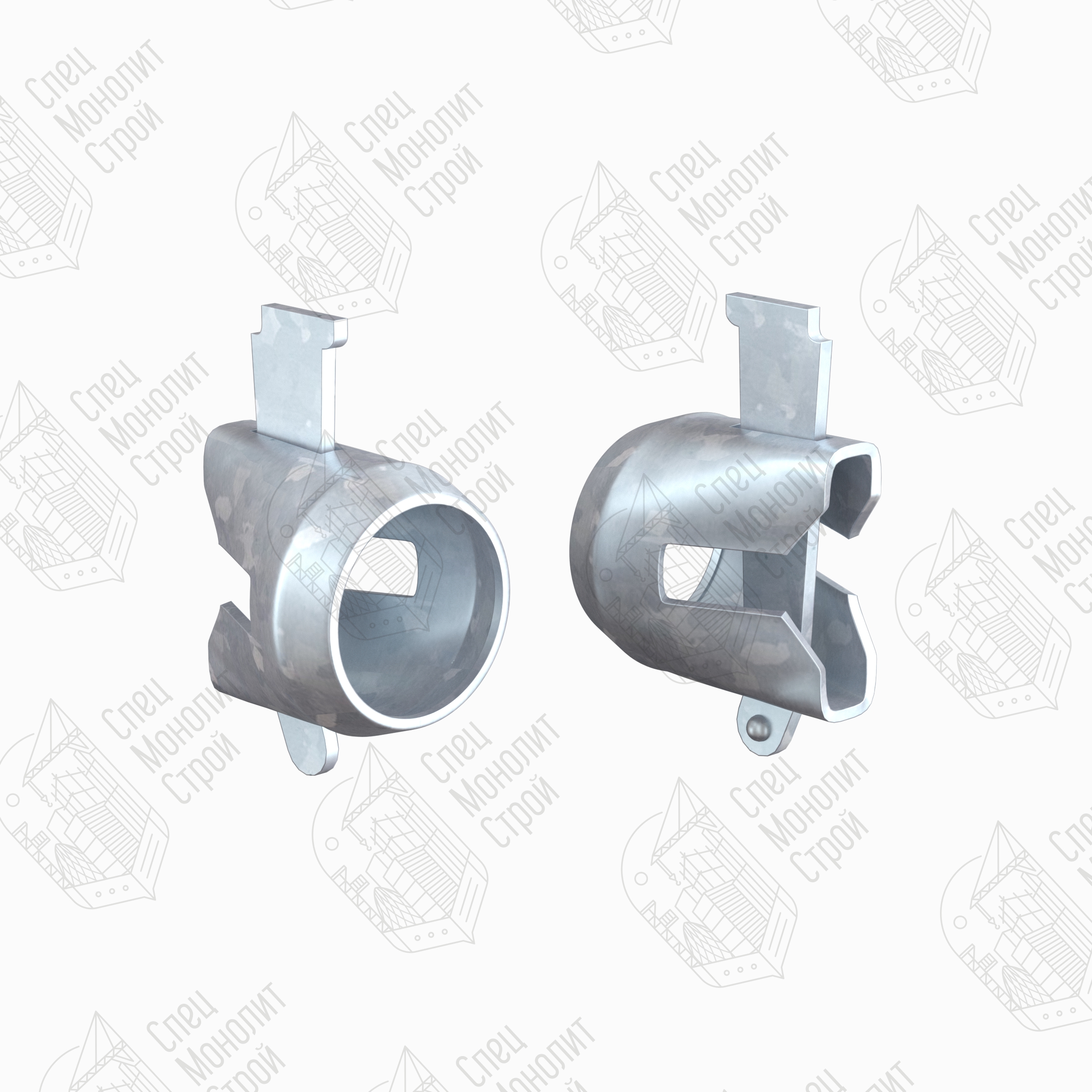 Скоба с клином представляет собой крепежную скобу с отверстием, которую приваривают к диагональным связям кдиновых строительных лесов с установочной высотой 60 и 100 метров и соединяют с фланцами несущих вертикальных стоек с помощью самозаклинивающегося клина.