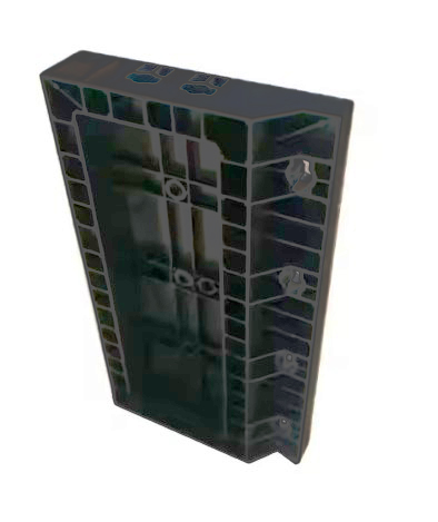 Угол внешний (наружный) формируется при помощи пластиковой панели «Угол внешний h-0,6м» и линейных панелей различных размеров в зависимости от необходимой толщины стены. Все элементы крепятся между собой при помощи замков-рукояток и в завершении фиксируются угловой выравнивающей балкой.