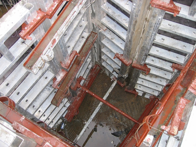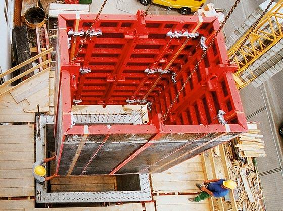 Опалубка лифтовых шахт на шарнирных углах – современная опалубка из блоков, преимущество которой состоит в сокращении сроков строительства. Универсальные опалубочные щиты подходящего размера соединяются в углах шарнирными элементами и упрочняются выравнивающими балками. Простая распалубка и перемещение внутреннего контура шахты являются основными преимуществами использования.